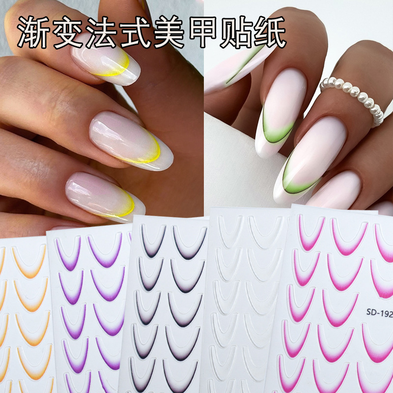 ネットの赤い爆発のグラデーションのフランスのネイルシールは簡単で、三日月のほほえみの縞のシールの弧の形の爪の貼ることができます。