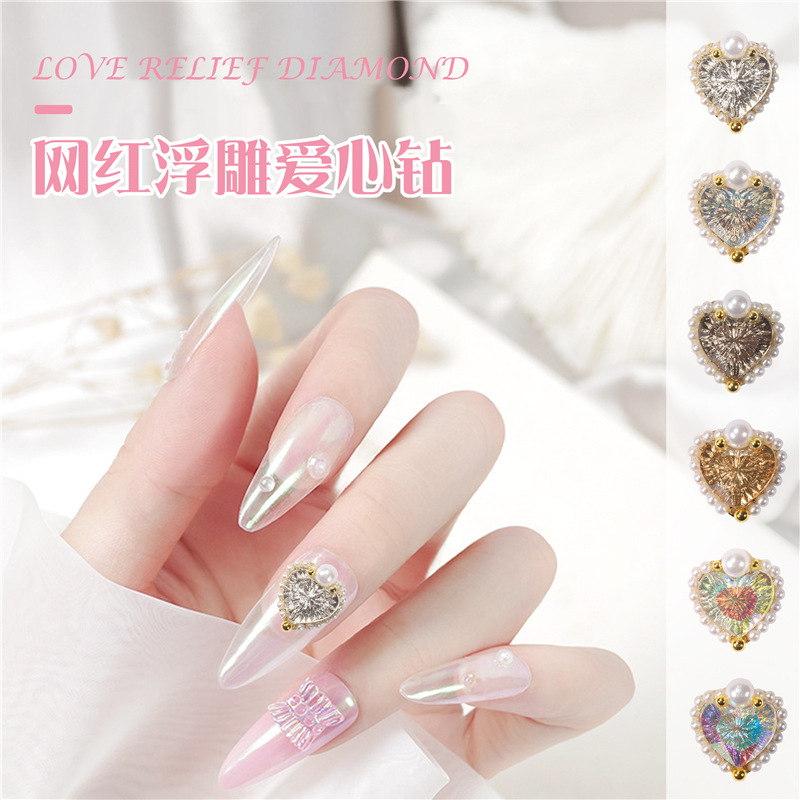 ネットの赤い新型のネイルの愛の浮き彫りのドリルの立体の弧度の真珠の桃の心の合金のアクセサリのdiyの爪の装飾のドリル