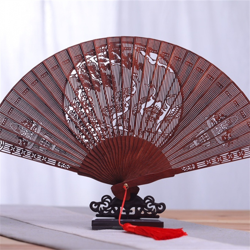 透かし彫りメイン花松鶴延年折扇中国扇風機沈香木ネット赤舞踊扇古風折り畳み扇子