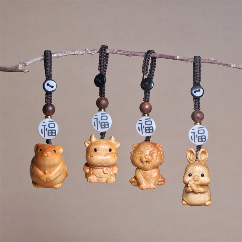 崖柏木彫り十二生肖携帯ストラップカップル包掛龍馬兎虎豚蛇鶏犬羊置物動物