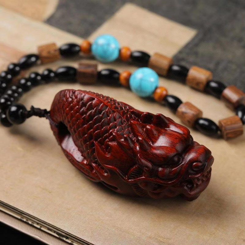 ザンビアの小葉紫檀木彫りの竜魚の手の件の魚化の竜文はストラップの男性を遊んで工芸品を持ちます。