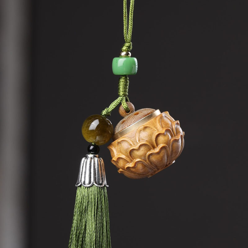 メーカー卸売りの緑檀木の透かし彫りの木製の香りの箱玉檀の香りの拡香器の文は彫刻のペンダントを遊んで飾ります。