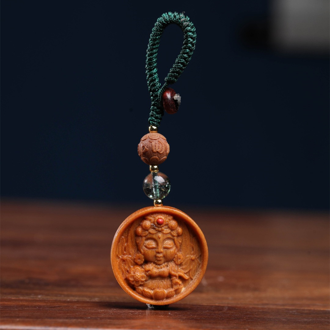 バービー檀香木彫り丸印小度母両面彫刻ペンダント自動車キーホルダー実木彫刻ペンダント