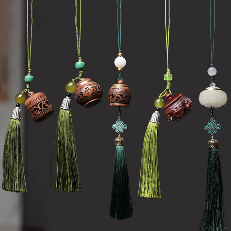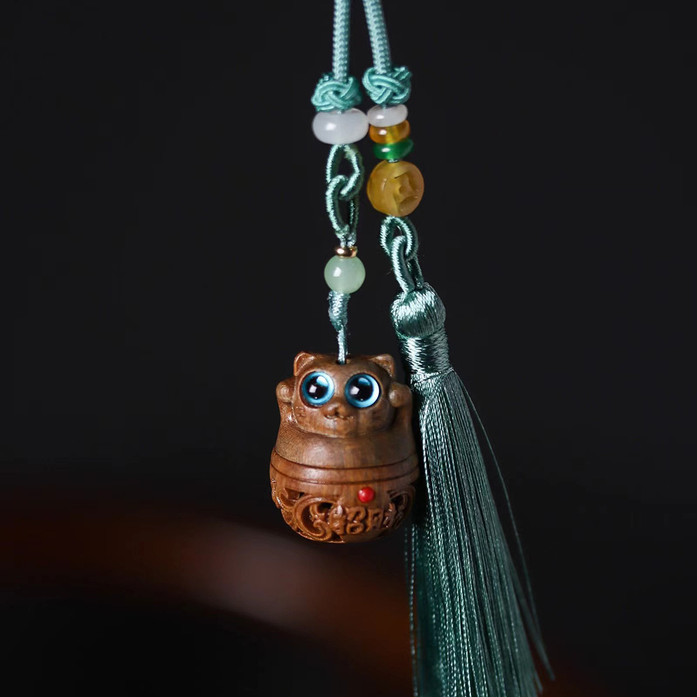 緑檀木彫りレトロな透かし彫り蓮猫香嚢アクセサリーキーホルダー