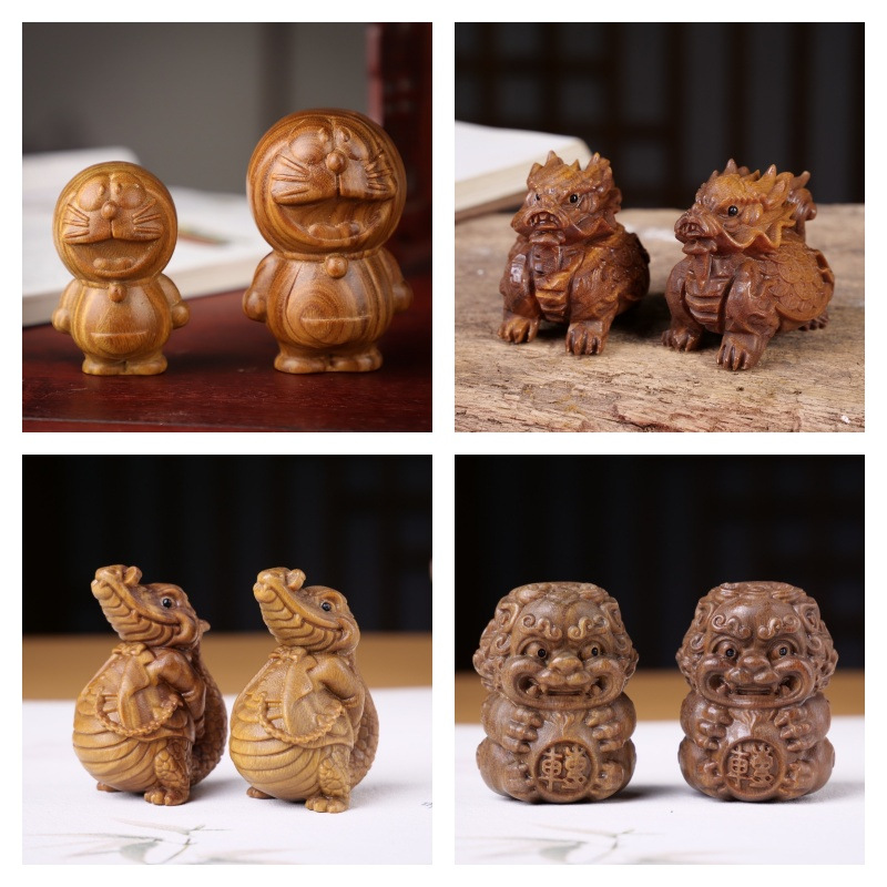 緑檀木彫りドラえもんのハンドルの漫画のかわいい機械は猫の家の装飾の客間の文を刺して置物を遊びます。
