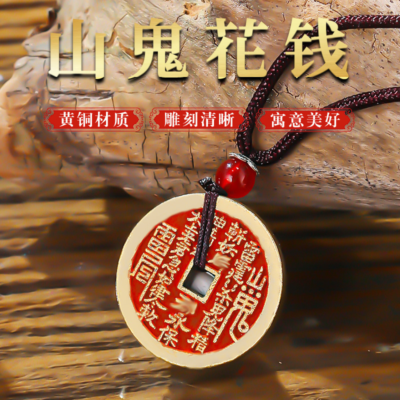 老山鬼はお金を使って古ペンダントに似せて八卦の朱砂の銅銭を飾って無事に男女のネックレスの本命のお守りを掛けます。