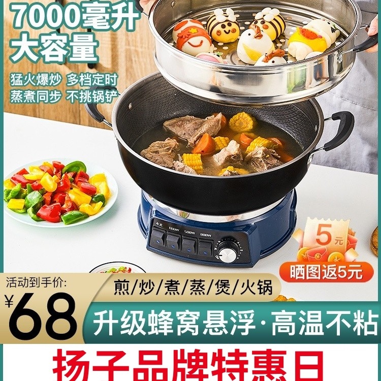 ハニカム電気調理中華鍋ノンスティック多機能オールインワン電気鍋家庭用電気鍋蒸し、揚げ、炒め用