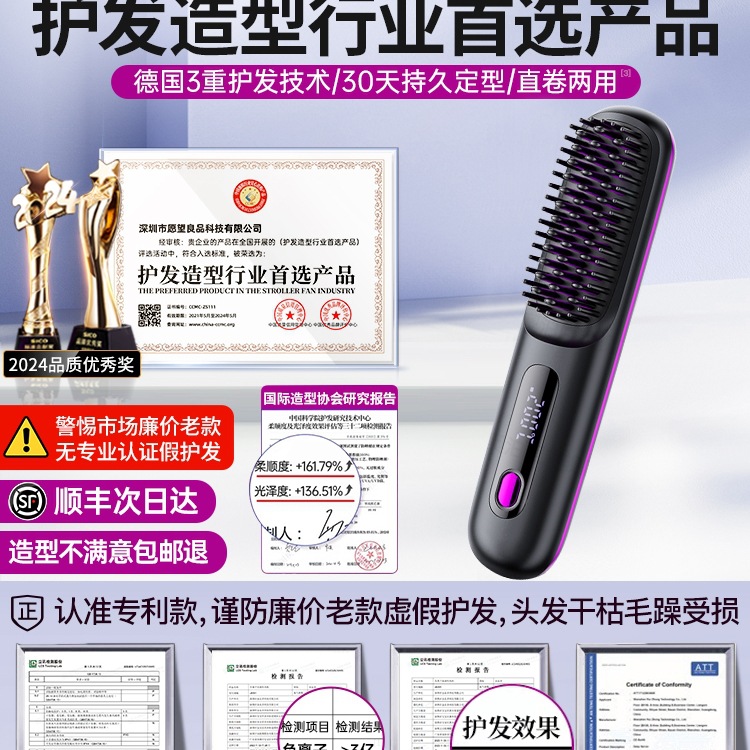 ワイヤレスマイナスイオンヘアストレートニングコームは髪を傷つけません、充電式ポータブルストレートとカーリングの両用電気コーム、ふわふわで頭頂部が高く、アーティファクトです。