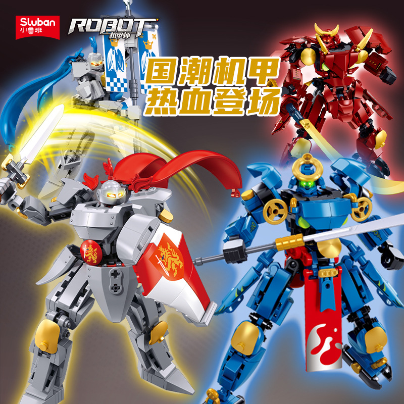 小魯班国潮機甲剣盾護旗紅蓮鎧騎士戦神組立模型少年組立積み木玩具