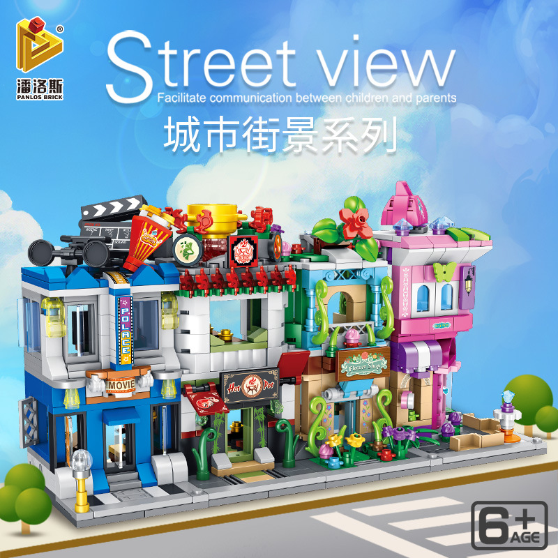 潘ロス都市街景シリーズ映画館火鍋店の花の香りの女性バッグ店の子供は積み木を混ぜておもちゃを挿します。