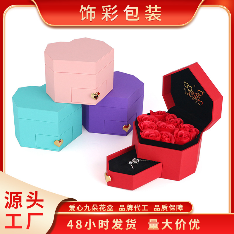 バレンタインデーのバラのアクセサリーの箱の二重の引き出しの9つの花の口紅の贈り物の箱のネックレスの指輪のプレゼントの箱の卸売り