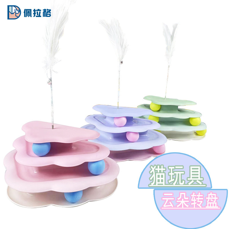 猫のおもちゃの雲の3層の猫の回転盤はスプリングの鈴の羽の猫のおもちゃを持って猫のペットの猫の用品を笑わせます。