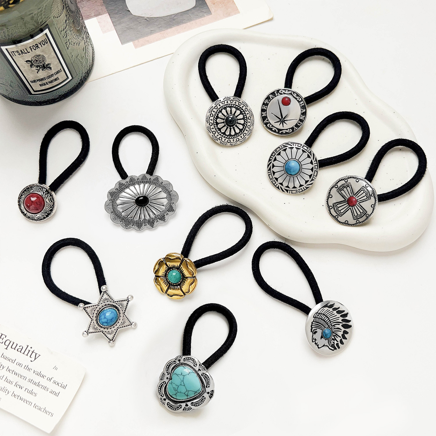 国境を越えたレトロなモザイク緑松石皮筋髪ひもアマゾンの人気高弾力欧米風髪ひも髪飾り