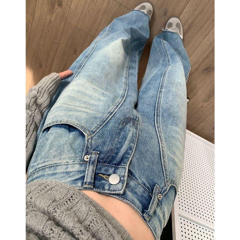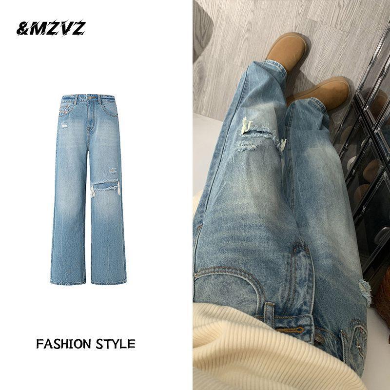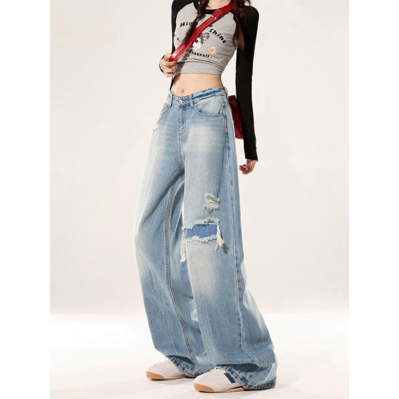 アメリカンストリートフェイクリッピングライトカラージーンズ春の新作ナロールーズレトロスリムウォッシュストレートパンツ