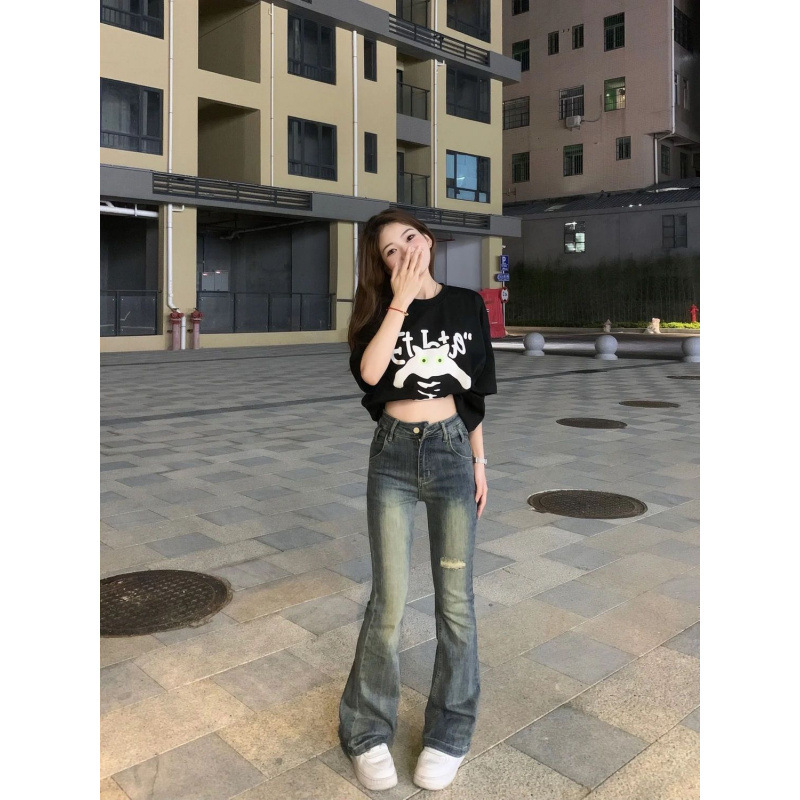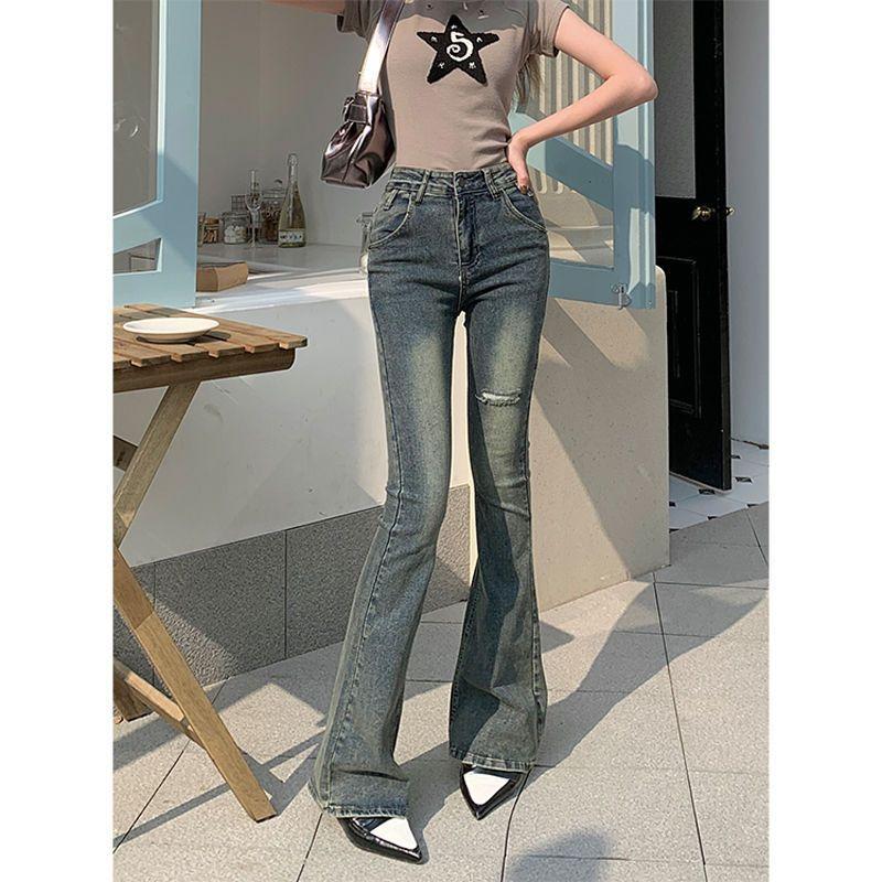 香港風オールドマイクロフレアジーンズ女性用春の新作ハイウエストダメージデザイン多用途シックなスリムロングパンツ