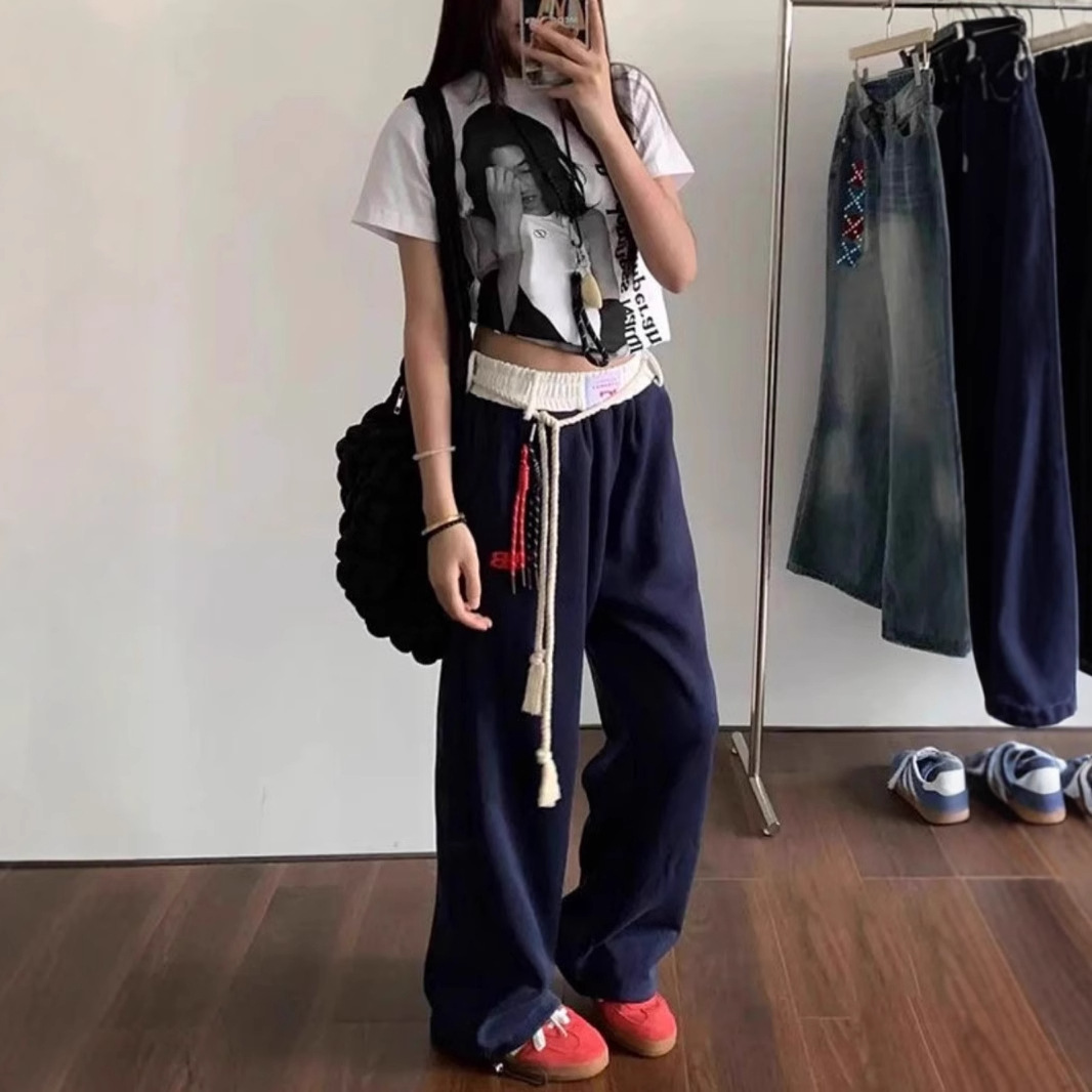新しいファッションのアメリカのレトロな色のバンドのスポーツのズボンの女性の春秋のデザイン感の小さい大衆のゆったりしているストレートなカジュアルなズボン