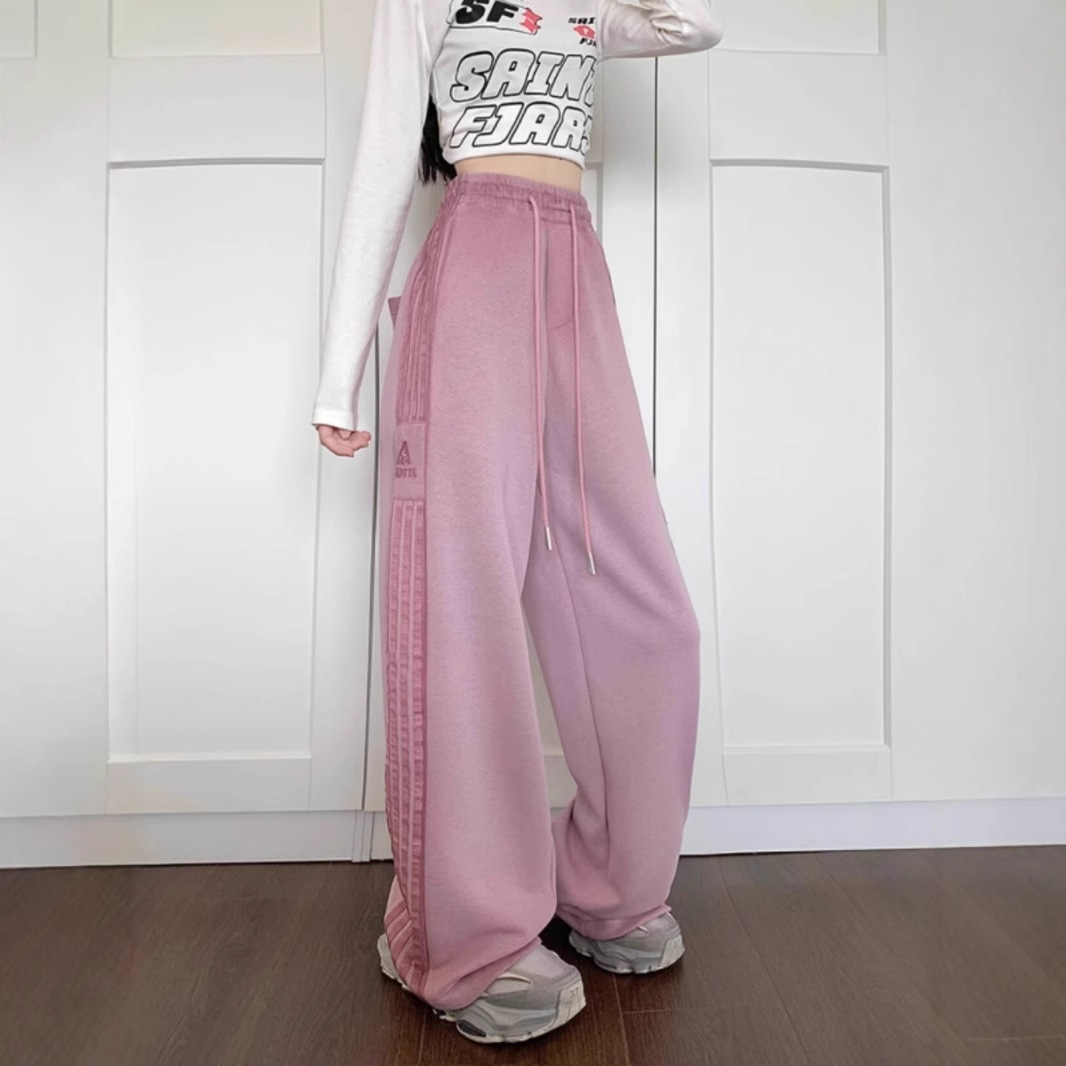 高街のピンクのストライプのスポーツズボンの女性の春と秋のゆったりとした直筒工装カジュアルなワイドパンツ
