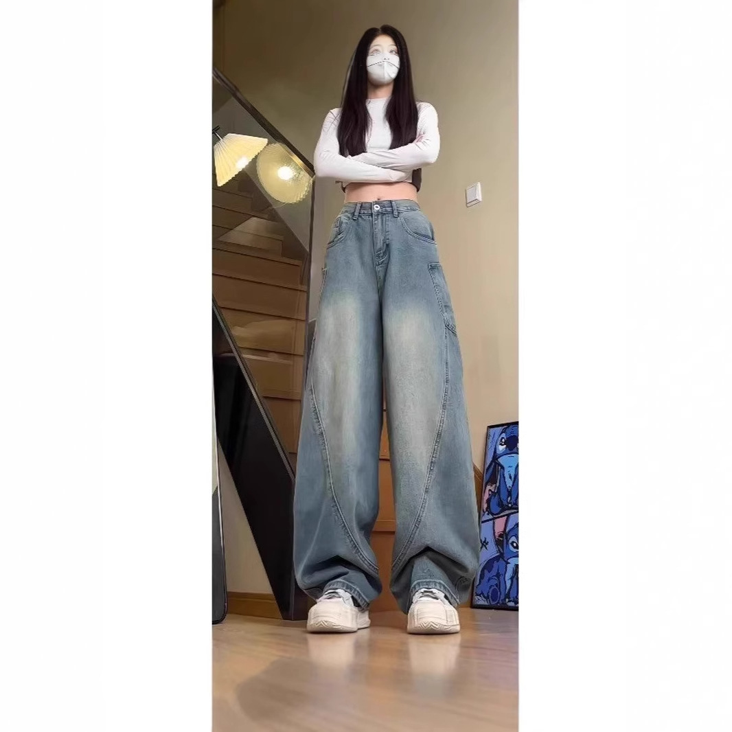 アメリカのレトロな広脚ジーンズの女性の秋のデザイン感があります。