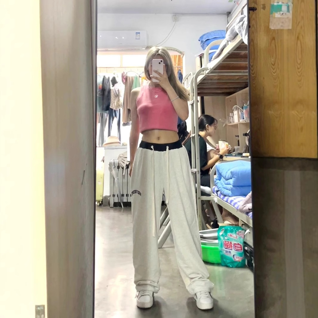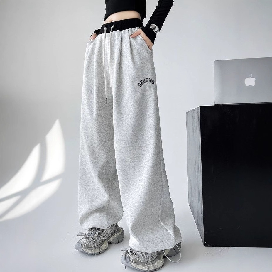 アメリカのカジュアルなスポーツズボンの女性は春と秋に色がゆるい広脚ズボンの灰色の衛ズボンのストレートな垂直感のダンスズボンにぶつかります。