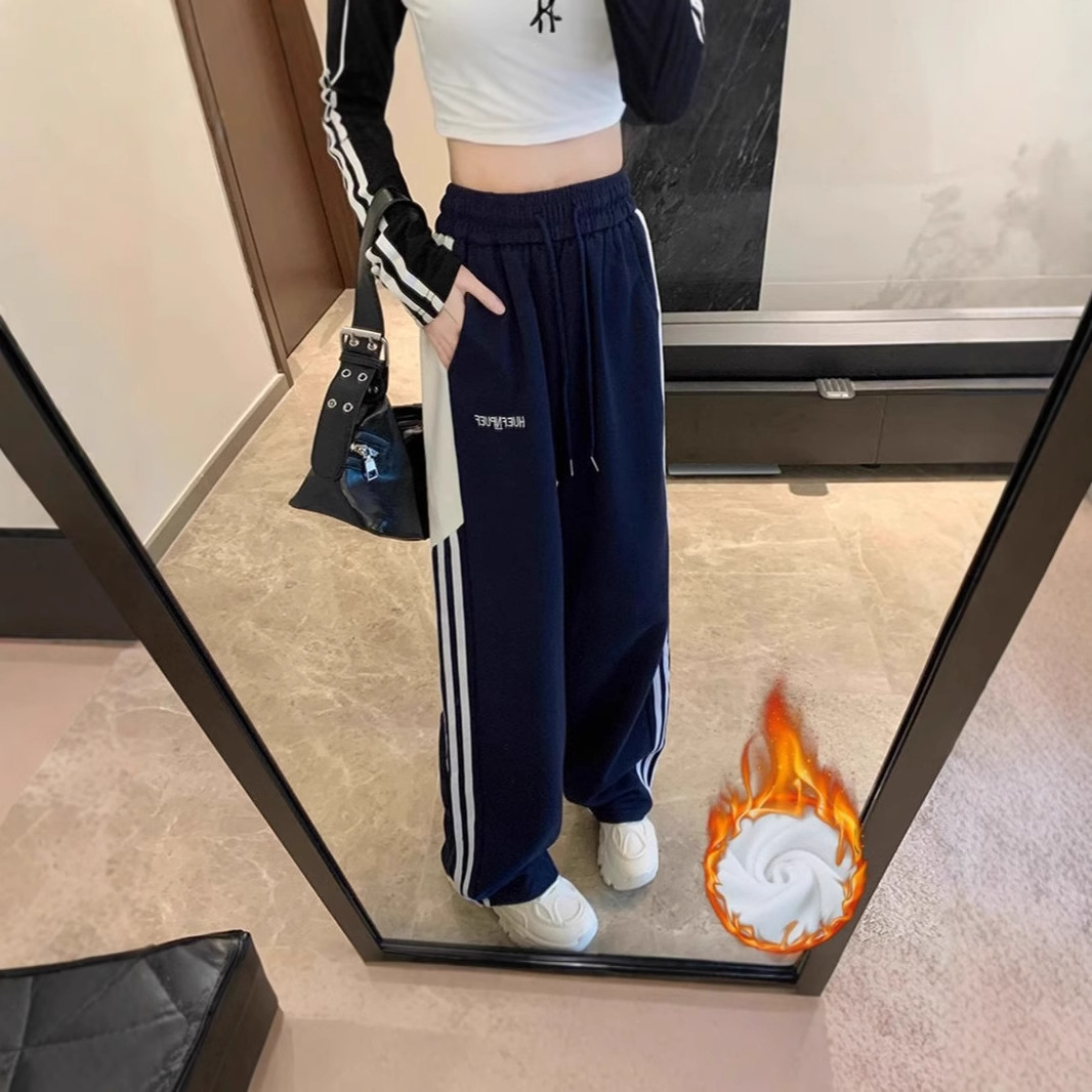 ベルベットのアメリカ式高街ダンスパンツ高腰ゆるいカジュアルパンツ女性冬の三本のバーの縞模様の広い脚の高いズボン