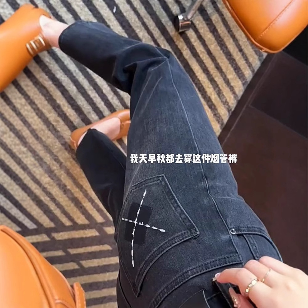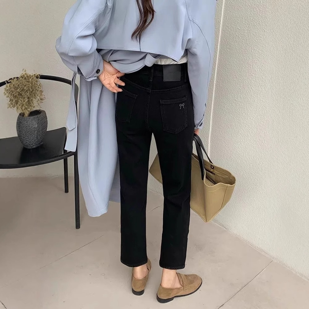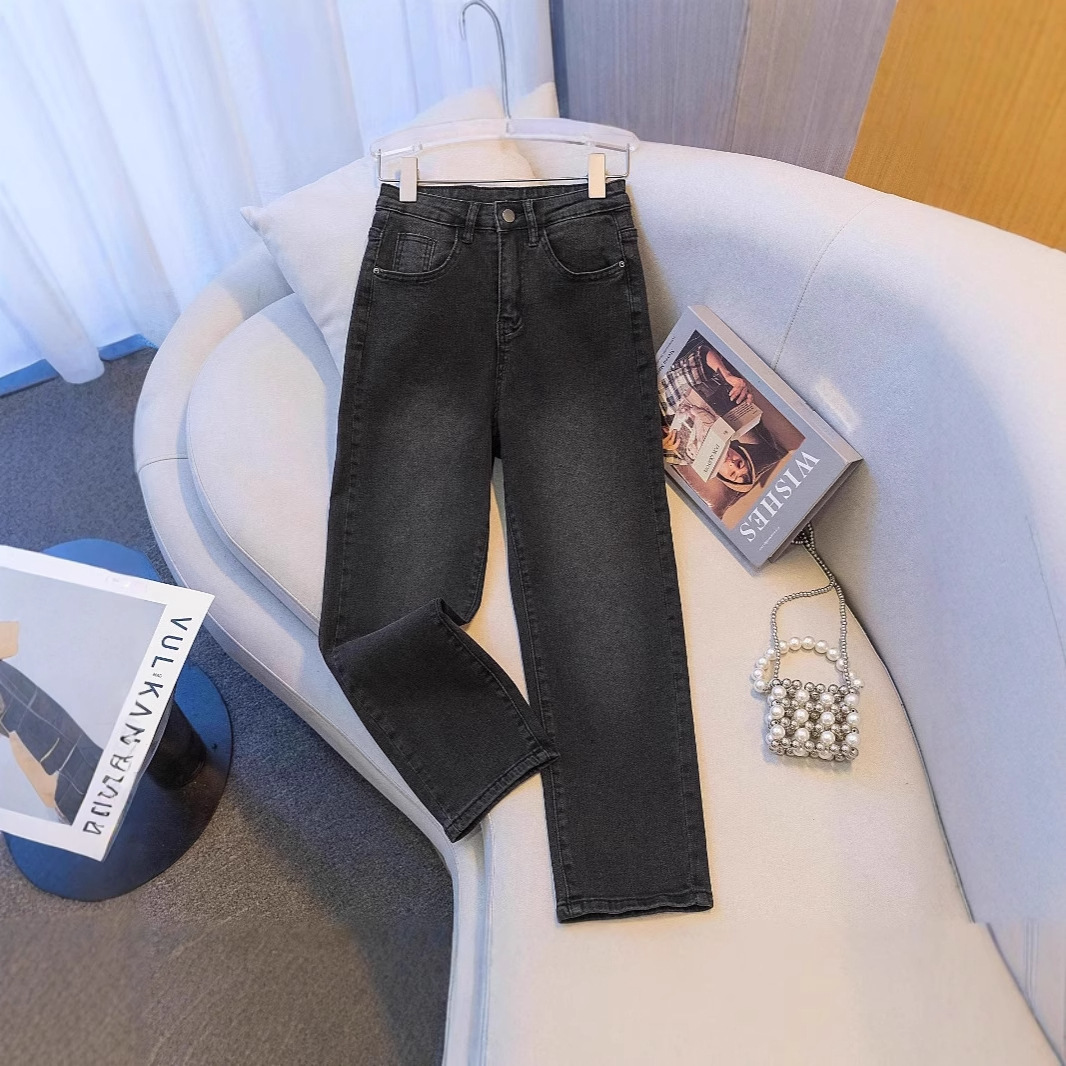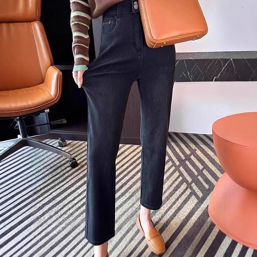 黒灰色のストレートジーンズの女性2024秋冬の新型の背の高い腰の修身はやせている9分のタバコのズボンを現します。