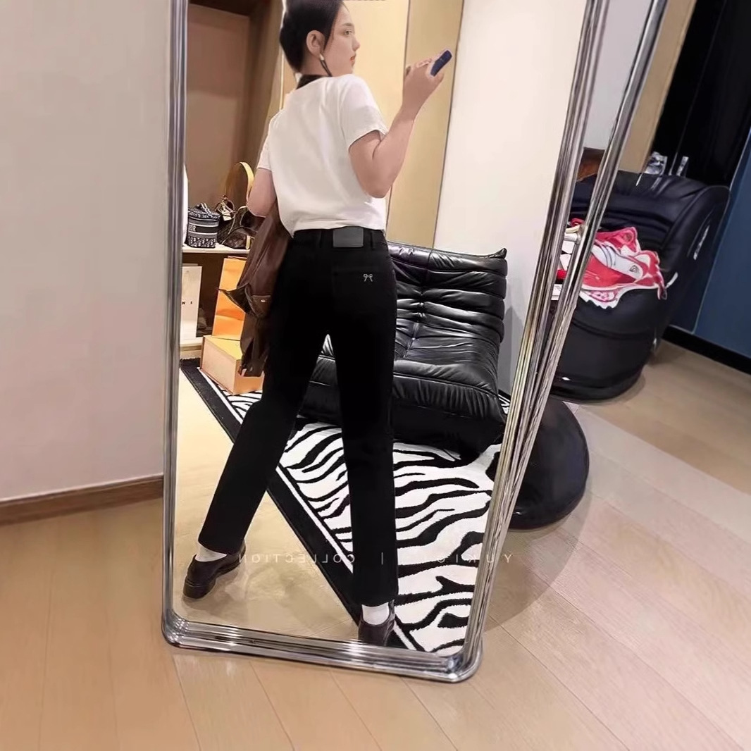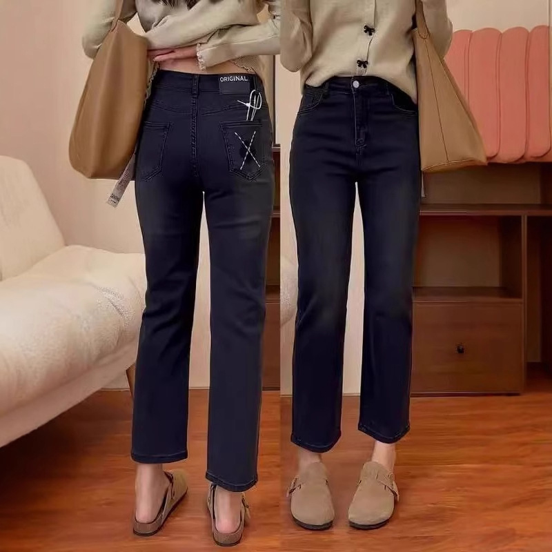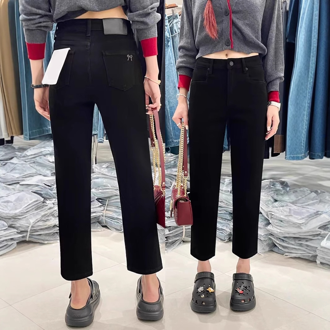 2024秋冬の新型弾力性の黒いストレートジーンズの女性の梨の形の体つきは高くて腰が高くてやせています。