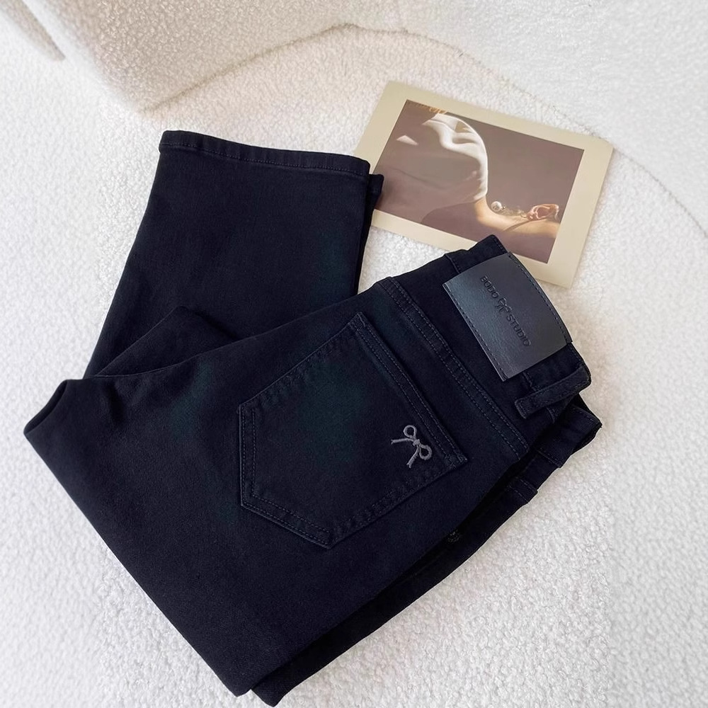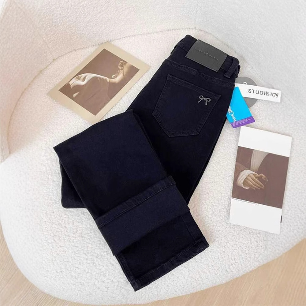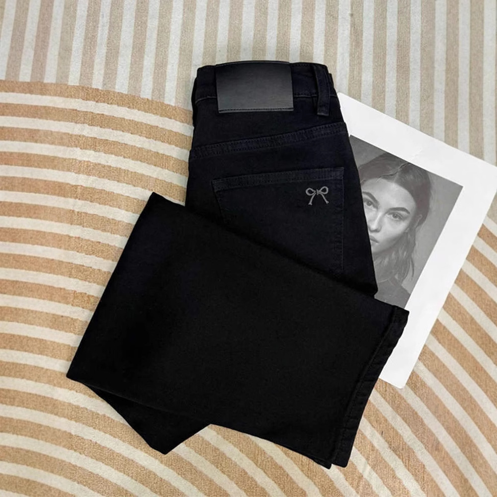 黒い蝶結びの刺繍のストレートジーンズの女性の秋の新型の高腰の修身はやせています。