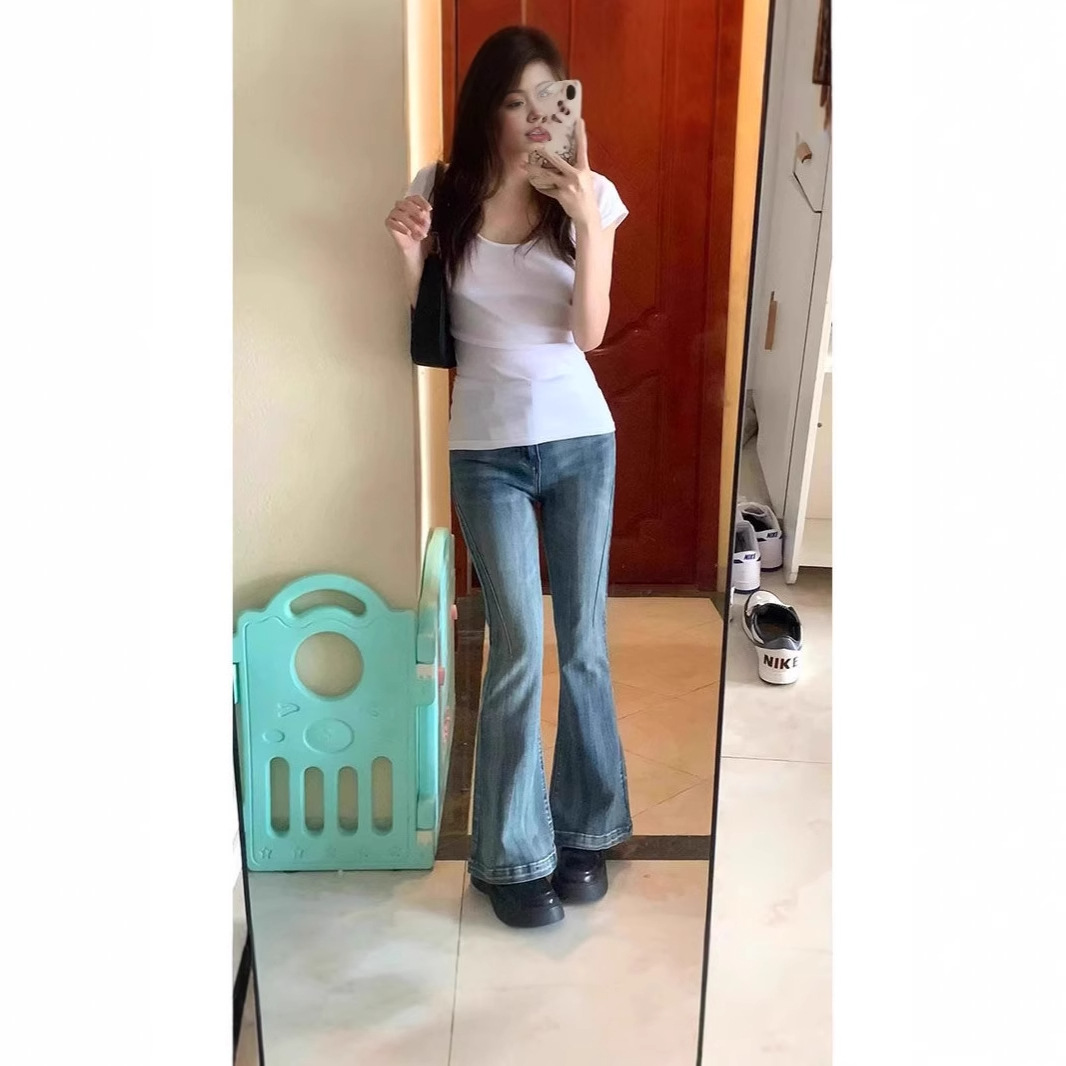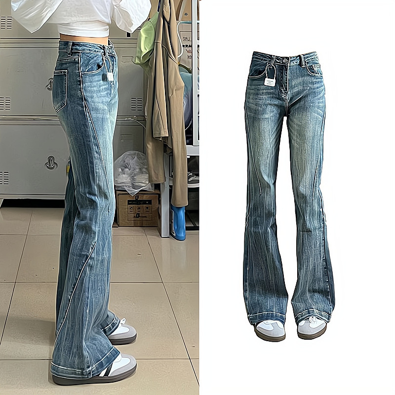 アメリカのレトロなギャルの高腰の小さいラッパのジーパンの女性の小さい体は古い弾力のまっすぐな筒をしてやせている馬蹄のズボンの潮を現します。