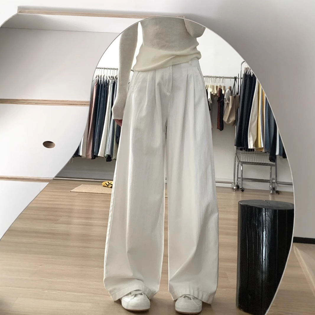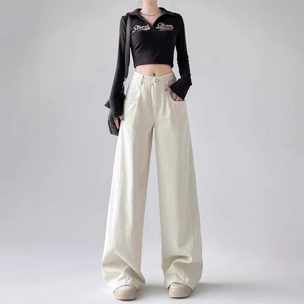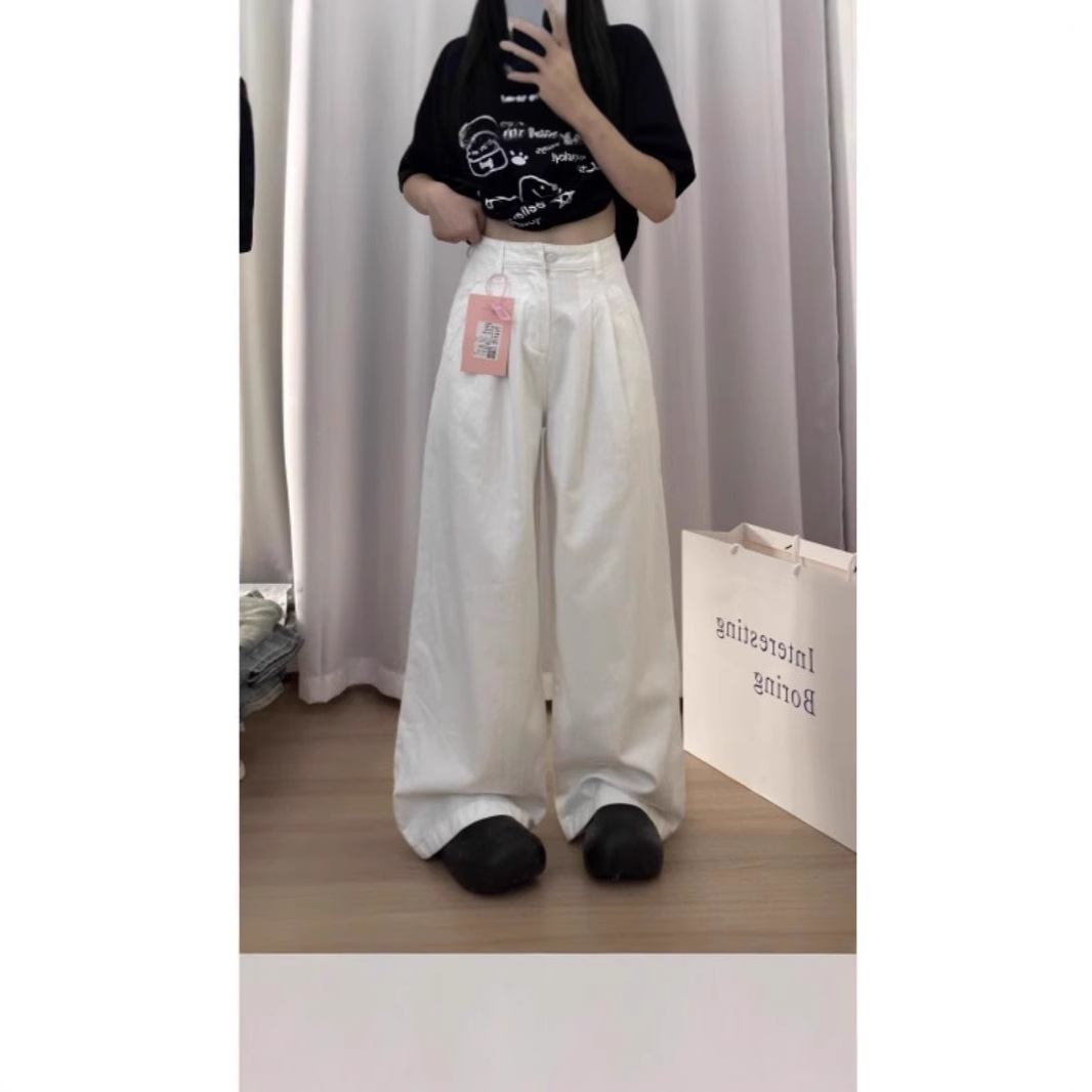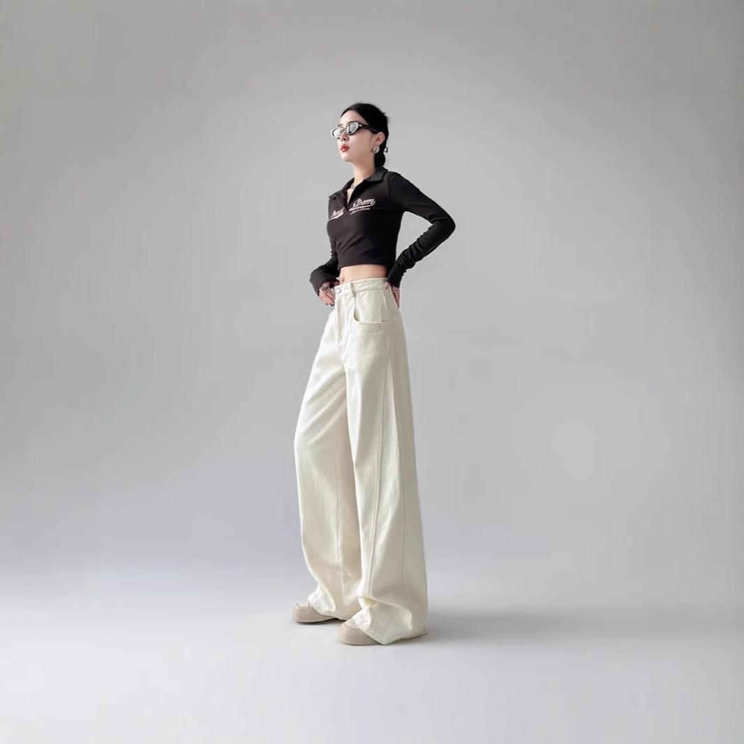 白い広脚ジーンズ女性春秋高街バナナパンツアメリカレトロ高腰ストレートゆったり感モップ