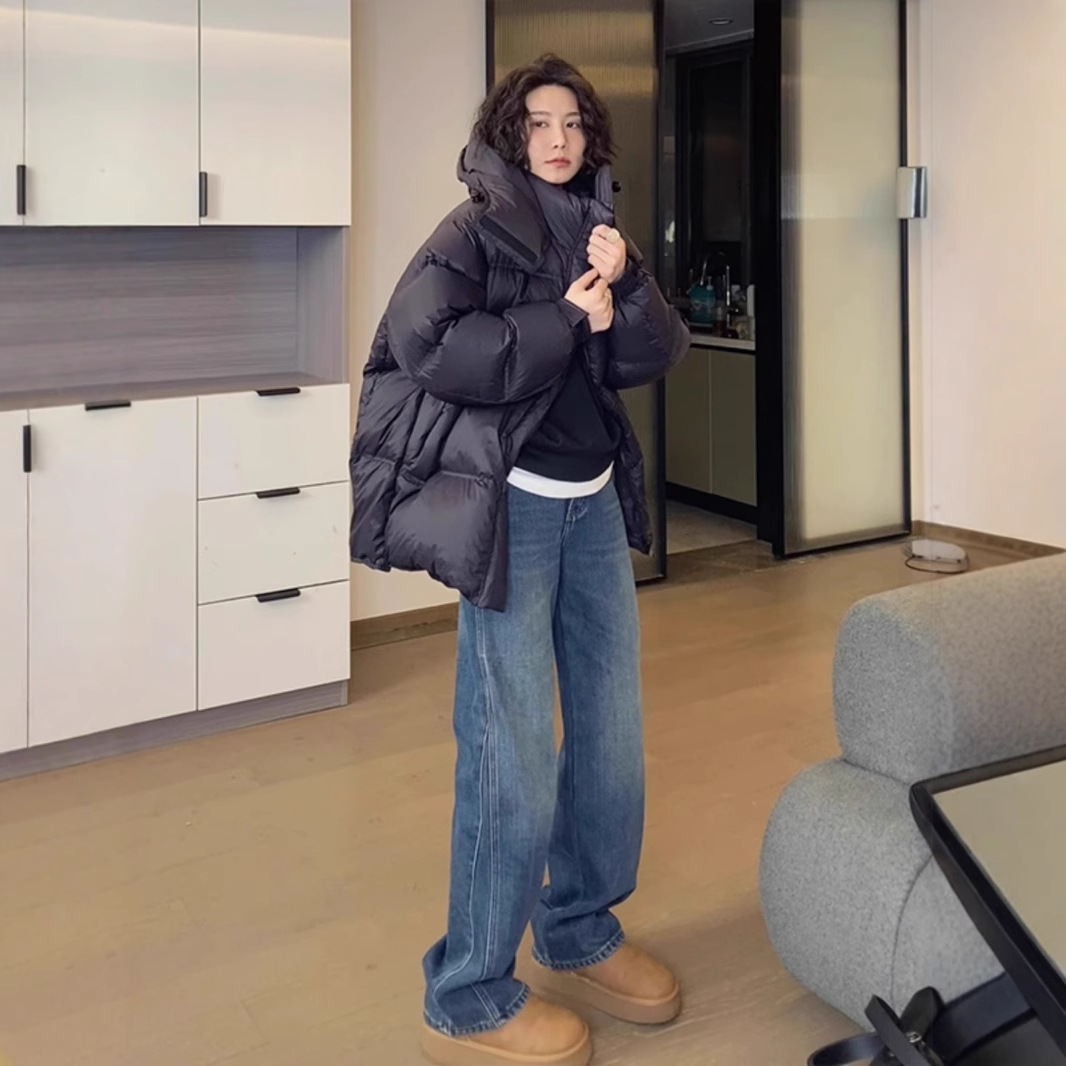 白いしわの広い足のジーパンの女性の冬のデザイン感があります。
