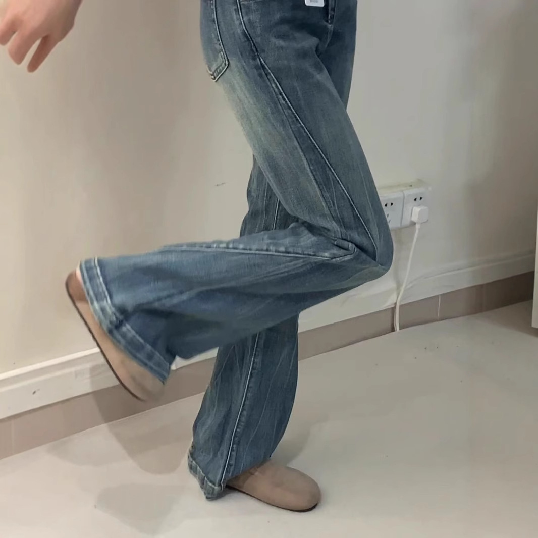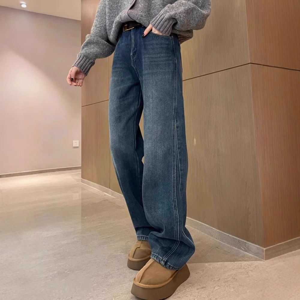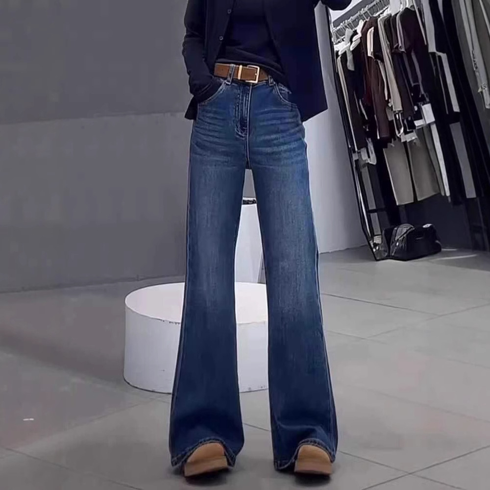 早秋のブルーマイクロラップジーンズ女性レトロ新デザインストレートパンツ高腰狭版修身広脚ラッパズボン