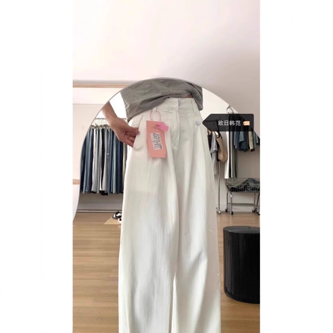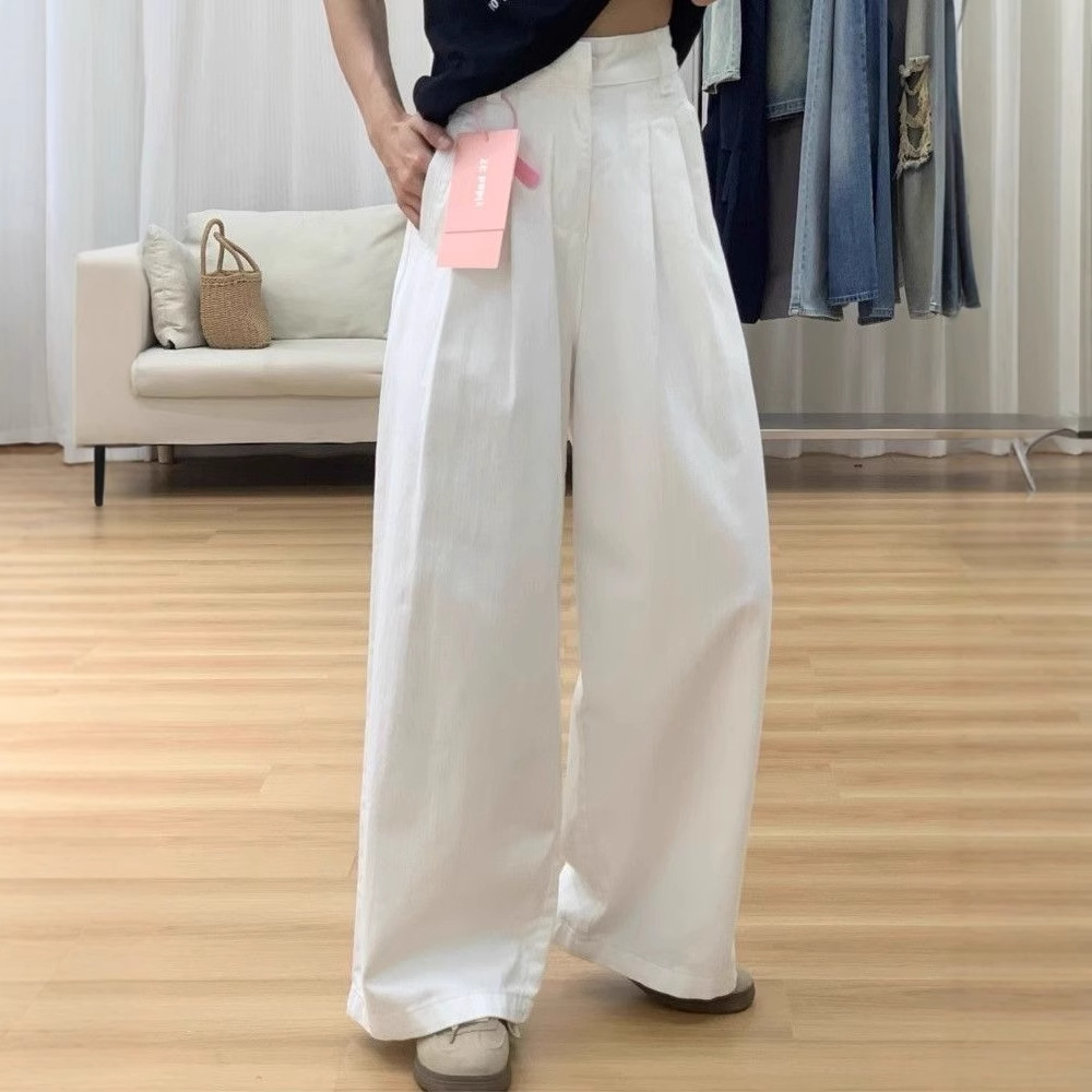 大きいサイズの白いゆるいしわの質感のストレートジーンズの女性の秋の新型の高い腰の垂れ下がった感じはやせている広脚のズボンを現します。