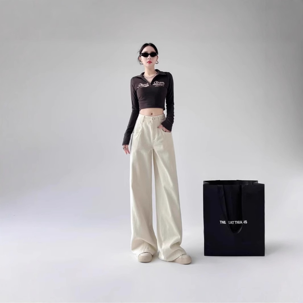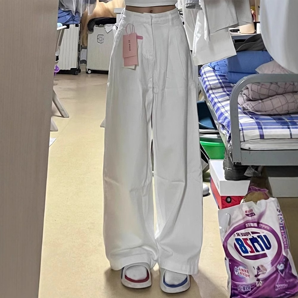 白い広脚ジーンズ女性秋高街バナナパンツアメリカレトロ高腰ストレートゆったり感モップ