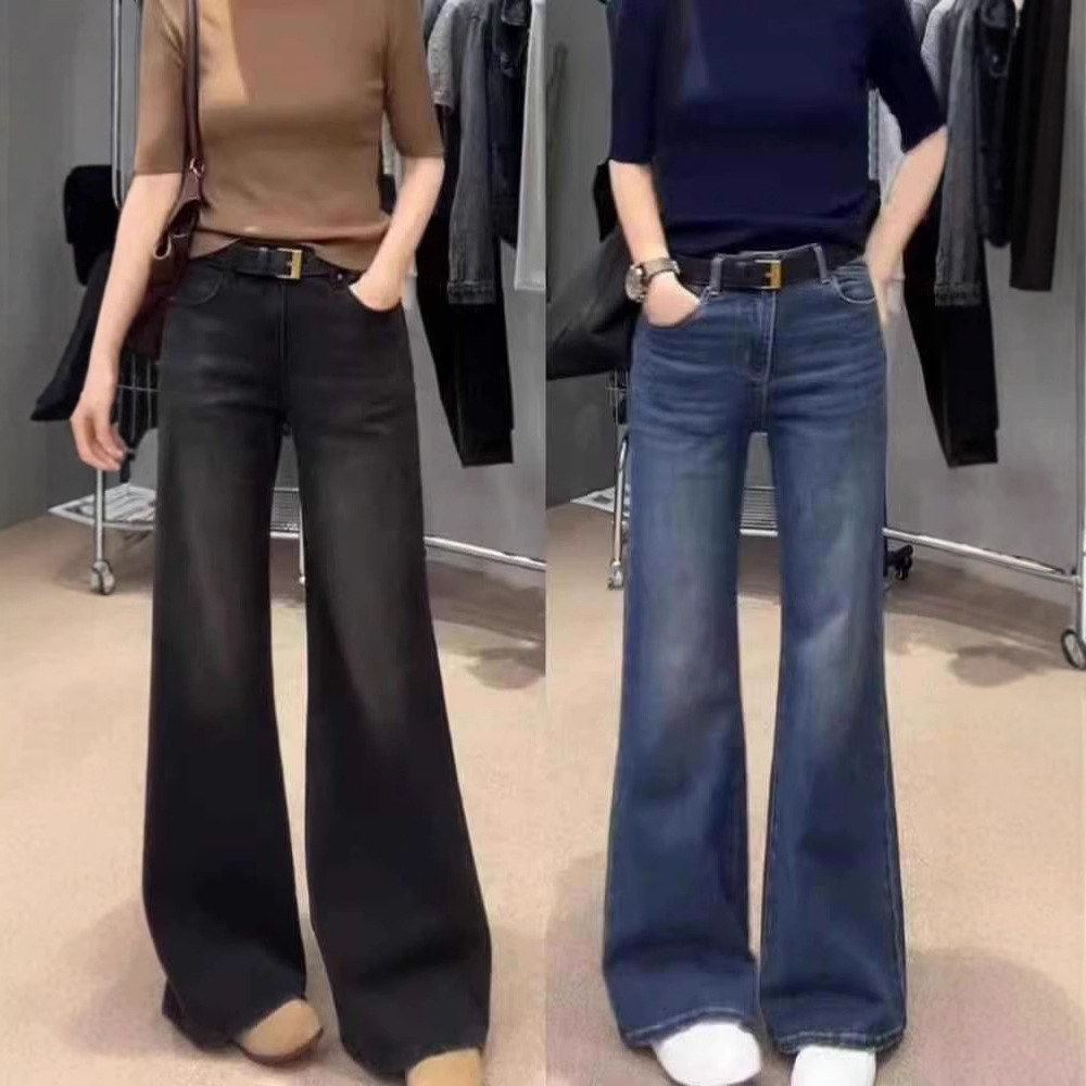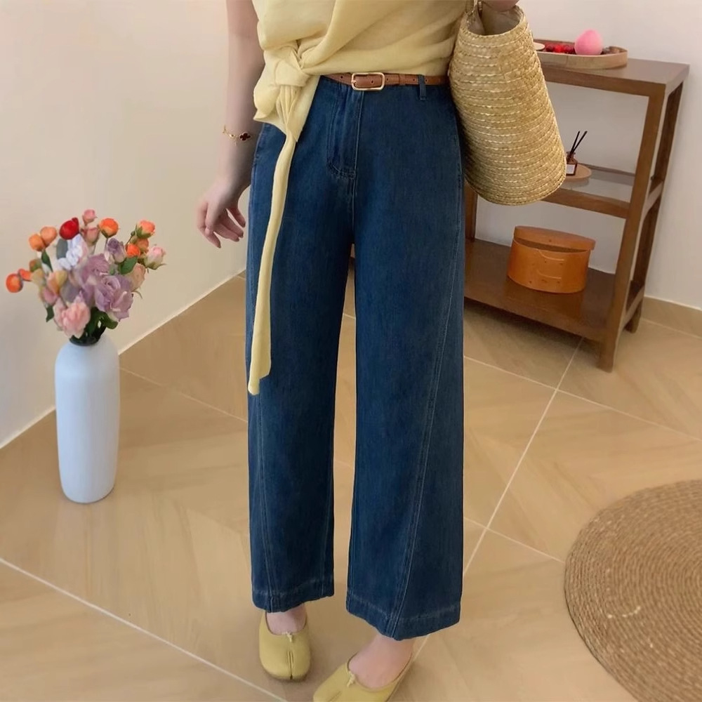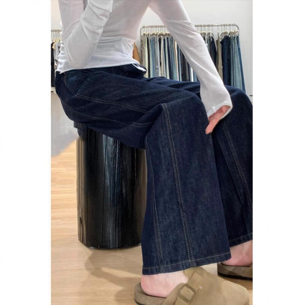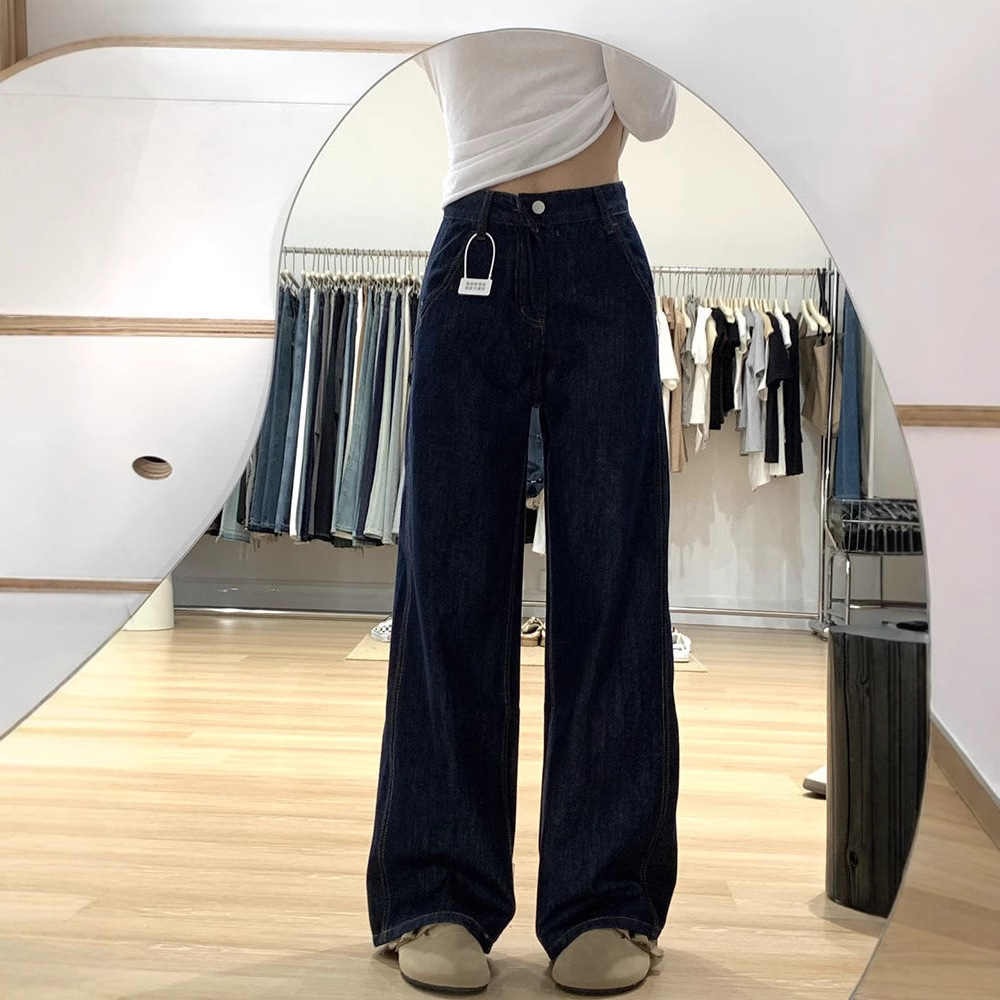 紺色の広脚ジーンズ女性秋の新しいデザイン感レトロでゆるい広脚が痩せているストレートなズボン