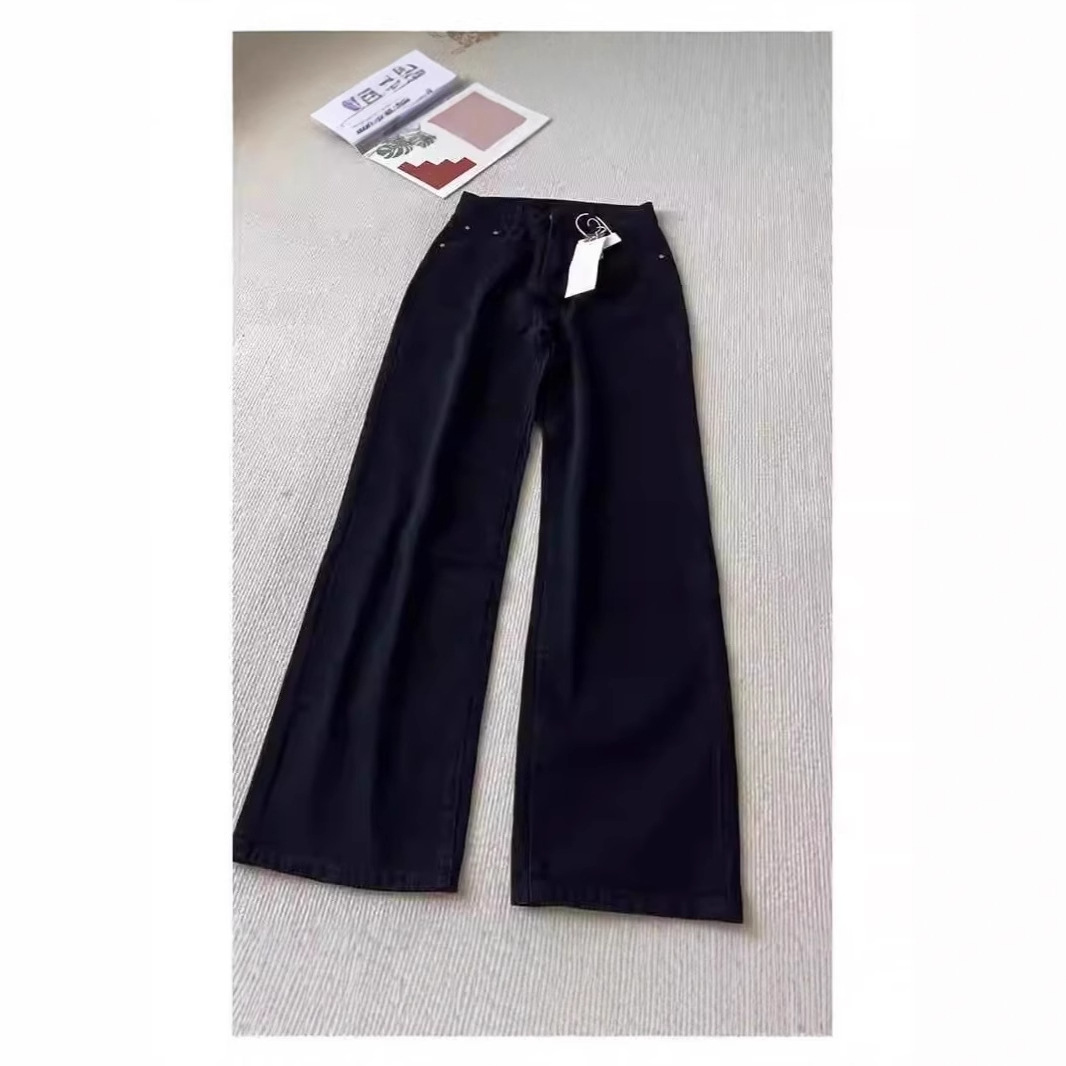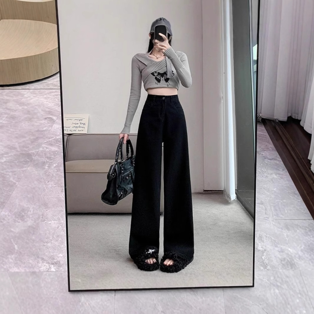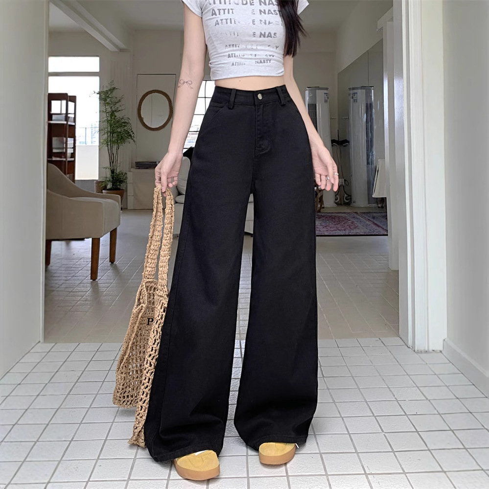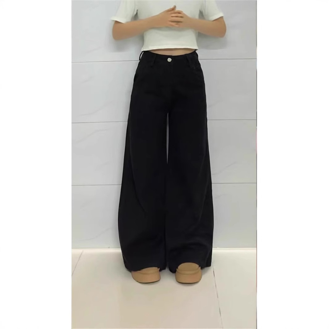 洋気黒シンプル風ジーンズ女性秋ハイウエスト痩せワイドパンツ気質カジュアル怠惰風ストレートパンツ