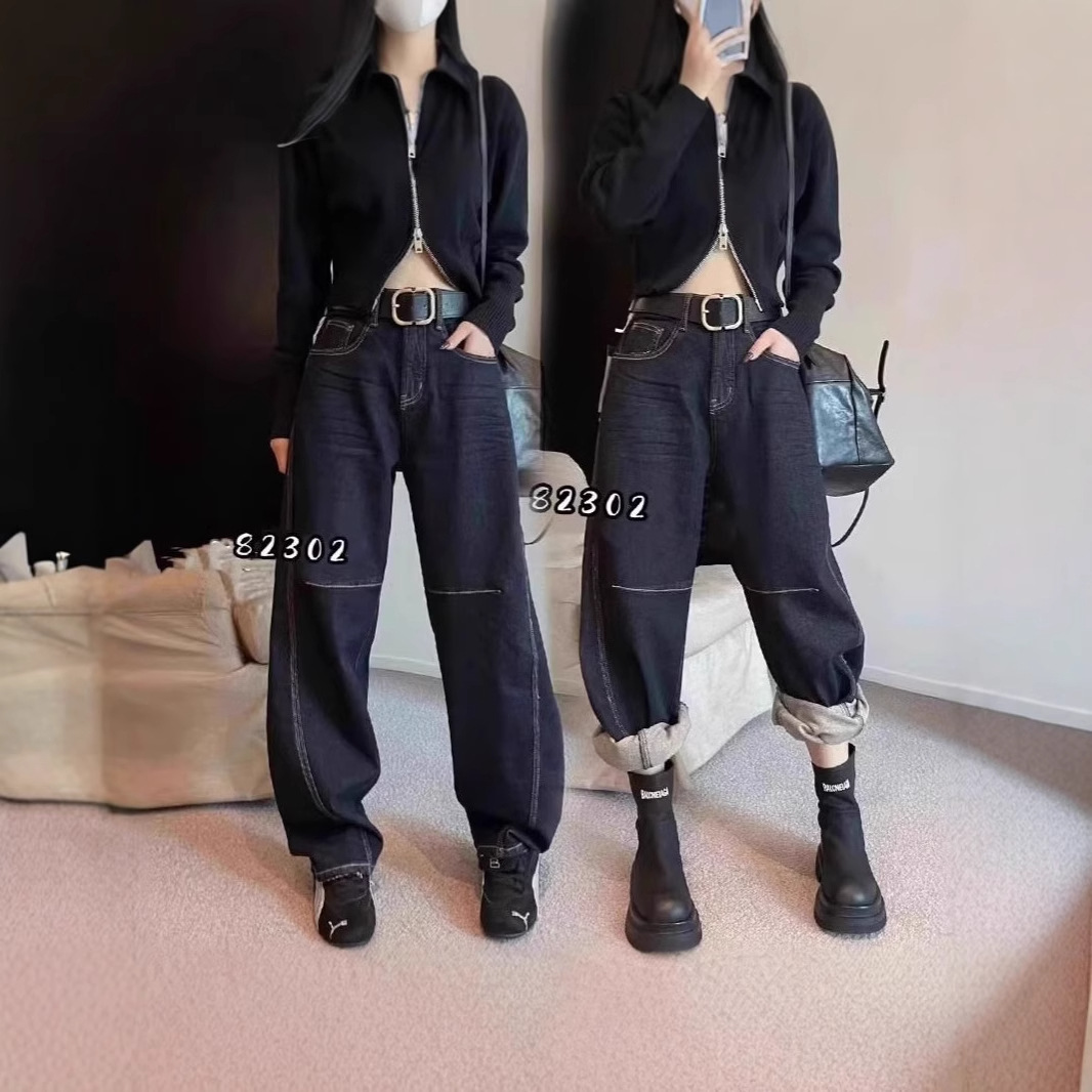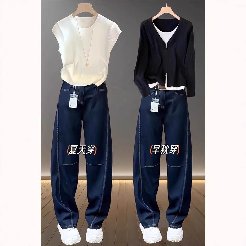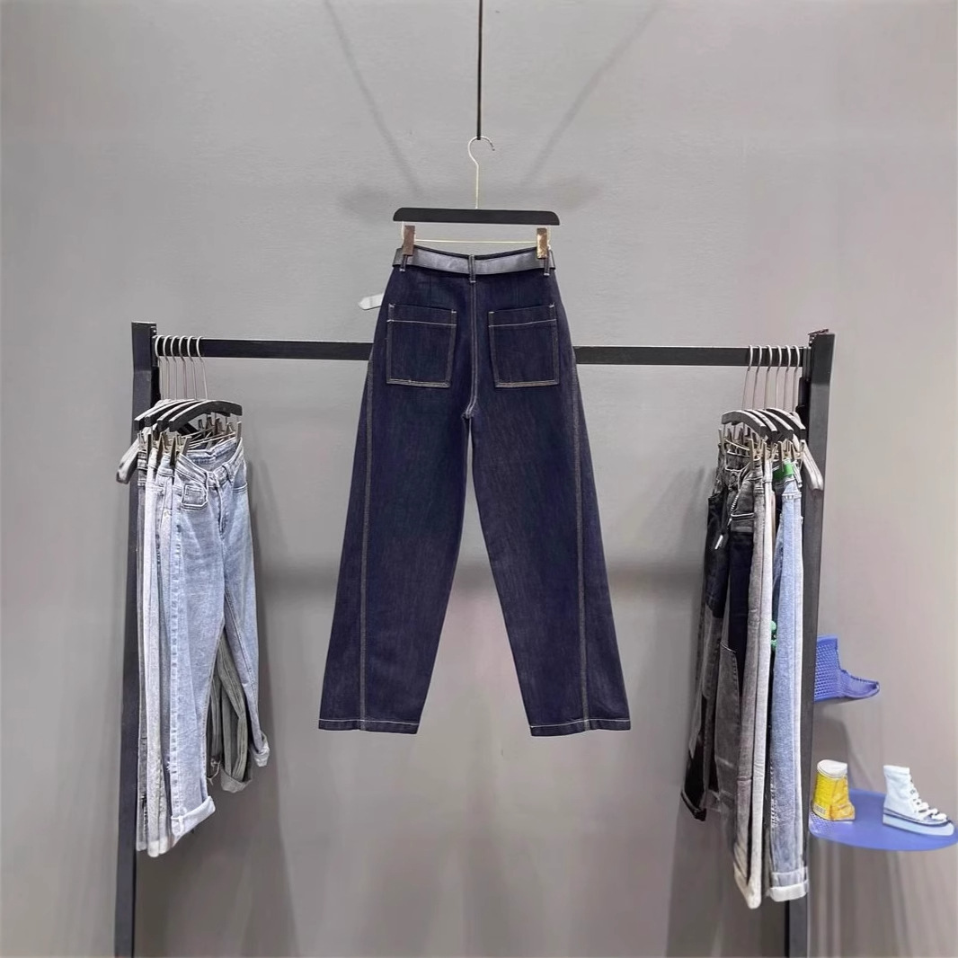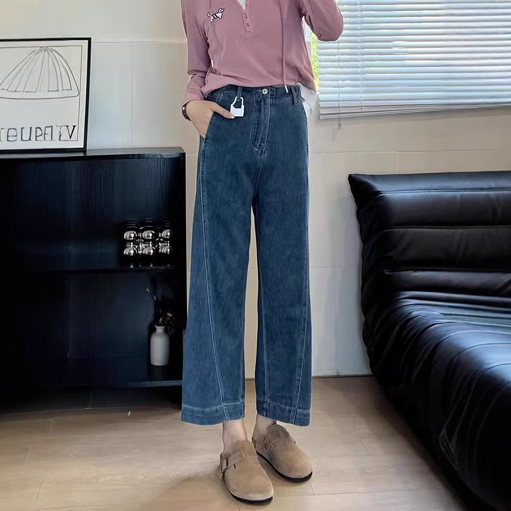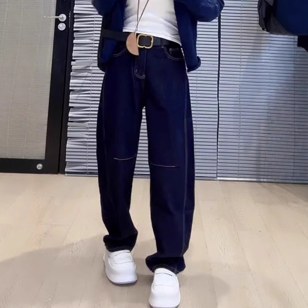紺色の曲がりくねったジーンズの女性2024秋の新しいゆるい痩せたカジュアルなストレートパンツが引きずられている… は...