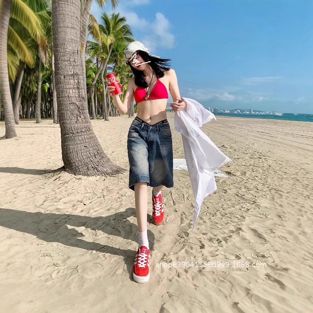 レトロなアメリカの5分のストレートのデニムのショートパンツのデザイン感があります。