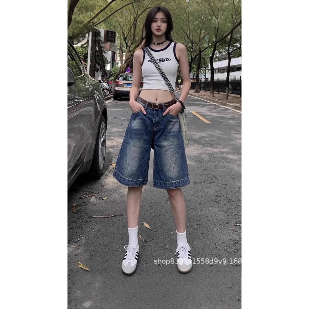 PAPSLアメリカレトロ五分デニムショートパンツ女性夏新作ハイウエスト幅ルーズカットスプリットストレートパンツ
