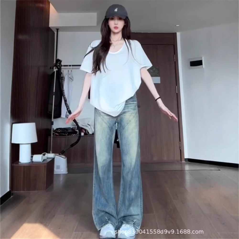 2024秋の新型の大きいサイズの復古のジーパンの女性の韓国版の高い腰の垂れ下がっている感じの百合のゆったりしているのが見えて痩せています。