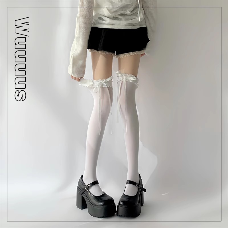乳白レースソックスレディースロリータロングニーソックスJKスイートリボン薄い太ももソックス