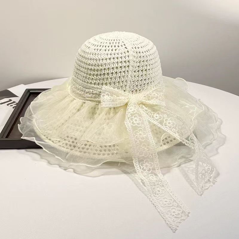 日焼け止め帽子、夏のレースのリボン、中空の手作りサンハット、大きなつば付き、女性用、フレッシュで甘いスタイル
