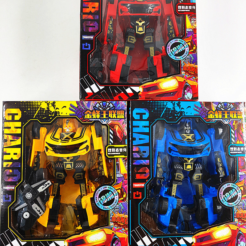 カラーボックスの変形のおもちゃの自動車の模型の金剛のロボットは子供の贈り物をして10元の店のおもちゃを並べます。
