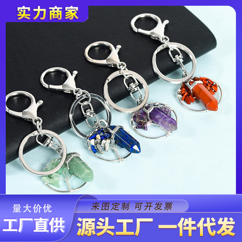 国境を越えてよく売れている天然水晶紫緑黄紅虎眼黒白莹青金生命の木と双尖柱キーホルダー