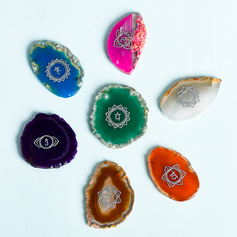天然瑪瑙の原石の銀色の記号の水晶の黄色の瑪瑙の紫色の青い七色の瑪瑙のセットの箱の置物の贈り物
