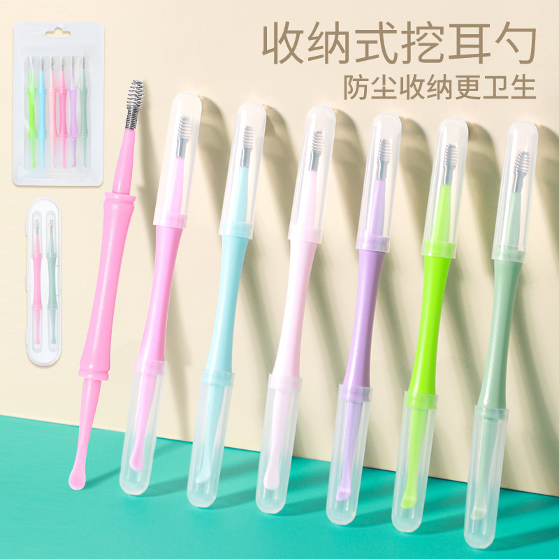両頭耳かきセット、収納可能で持ち運びに便利なカラフルなプラスチック製耳道清掃ツール、スパイラル耳かき