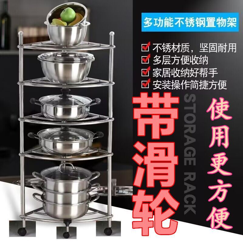 台所の棚はステンレスの三脚を厚くして鍋棚の隅に置いて台所用品の三角洗面器を収納します。