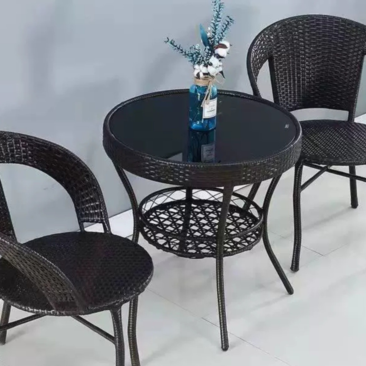 ベランダのテーブルと椅子の組み合わせの藤の椅子の3つのセットの屋外のテーブルと椅子の別荘の庭のテーブルとテーブルの藤はレジャーの椅子を編みます。