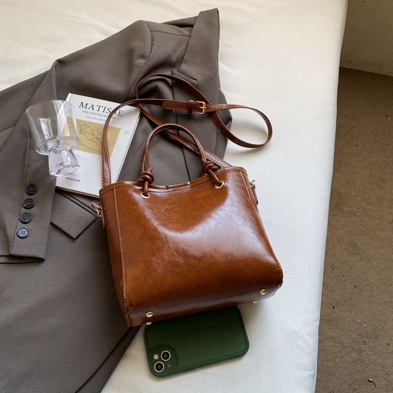 油皮レトロ通勤バケツバッグ女性2025新作春百合大容量手提げシングルショルダーバッグ
