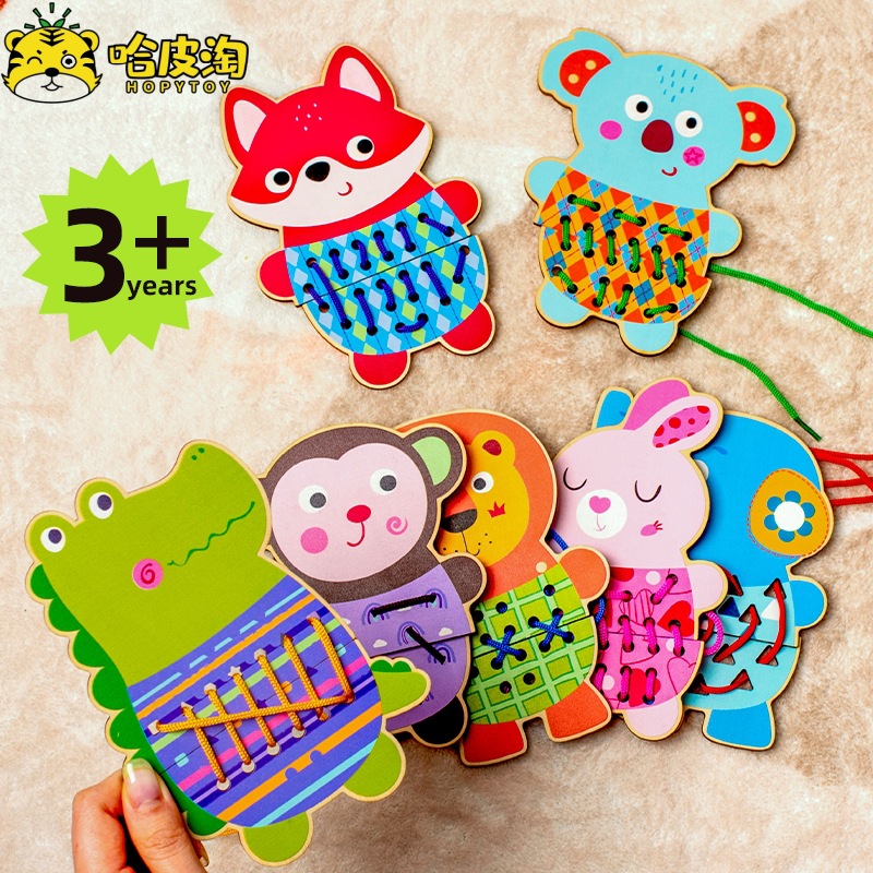 木製幼稚園の蒙氏早教益知能開発教具小動物はセーターを着てロープを通す
