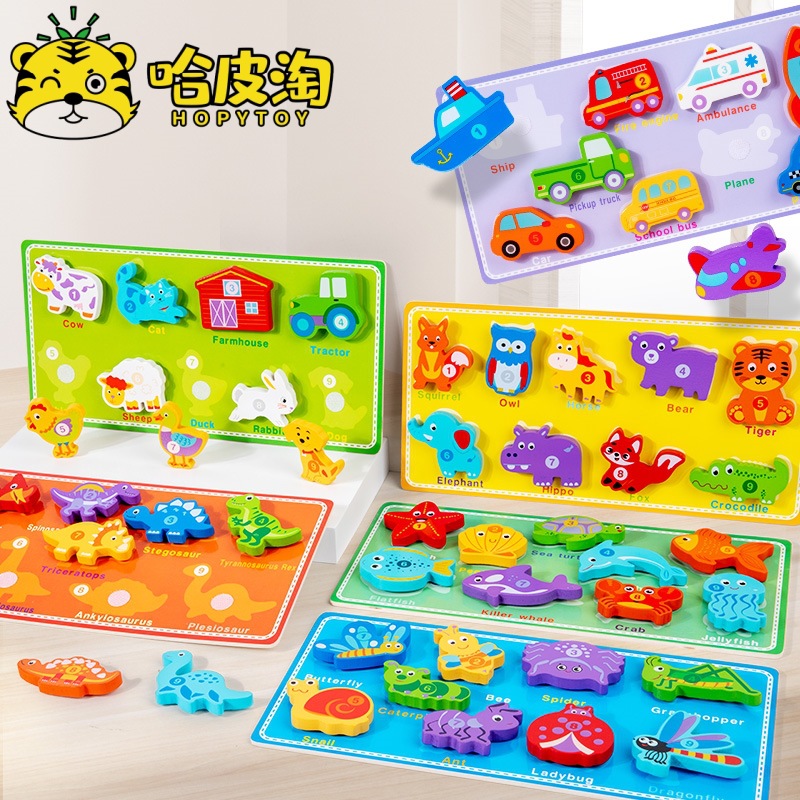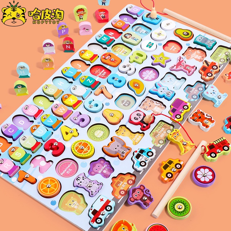 新商品の露店の商品の供給源の手は板のパズルの子供をつかんで早く木のおもちゃのアルファベットの果物の知能の数字の積み木を教えます。